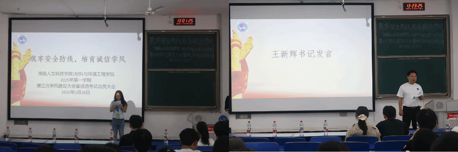 为进一步加强学风建设,强化学生诚信意识与安全观念,2025年5月29日中午,材料与环境工程学院在致远楼119教室隆重召开2025年上学期第三次学风建设大会暨诚信考试动员大会。学院党总支书记钟勇、党总支副书记王新辉、全体辅导员老师、2022级至2024级各班级的班委代表参会,学习实践部志愿者陈洛莲主持会议。会议伊始,勤助部志愿者易芷倩作为团学会代表率先发言。她围绕诚信教育与考试规范展开深入阐述,特别是考风考纪建设方面,着重强调随着五月宣传月的推进和期末考试的临近,...