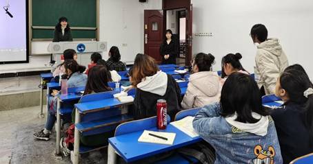 童主任讲座过后,由已经成功获得教师资格证的学生分享面试经验及应考技巧。她们指出在模拟讲课训练的过程中大家要总结出适合自身的教学模板,并加以灵活运用;她们还表示在面试过程中,答题一定要层次清晰,态度一定要诚恳端正,沟通一定要积极有效。