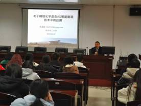 吴道新教授就其主要的研究方向“电子精细化学品与技术、功能纳米材料设计、新能源材料”等三个方面作了学术报告,并进行了精准解读。报告内容丰富精彩,前沿且接地气,为太阳成官网师生创新研究提供了良好的思路。吴教授从他与他的研究生团队的工作着手,为我们详细介绍了“电子精细化学品与技术”在生产和生活中的应用,并着重讲解了他实验室的研究成果是如何在工厂进行转化的。这场讲座让同学们更加了解了电子材料相关技术知识与实际应用,大大地开阔了同学们的视野,提高了同学们对科研的兴趣。