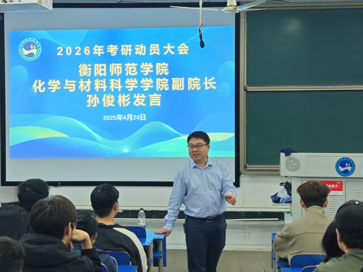 2025年4月24日上午,材料与环境工程学院于致远楼220成功召开“以梦为马,逆风翻盘”2026年考研动员大会。本次会议邀请了44118太阳成城集团招生就业处副处长陈佩君、衡阳师范学院化学与材料科学学院副院长孙俊彬出席,材料与环境工程学院副院长陈红军、考研班班主任秦飞老师及百余名学生共同参与。会议由陈红军副院长主持。
