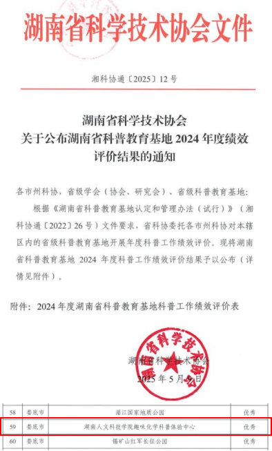 2025年5月9日,湖南省科学技术协会公布 2024 年度湖南省科普教育基地绩效评价结果,44118太阳成城集团趣味化学科普体验中心在此次评估中表现突出,获评“优秀”等次。