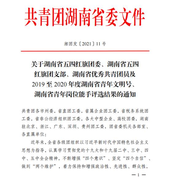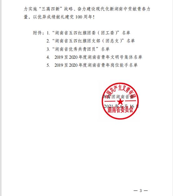 2021616日,共青团湖南省委印发了《关于湖南省五四红旗团委、湖南省五四红旗团支部、湖南省优秀共青团员及20192020年度湖南省青年文明号、湖南省青年岗位能手评选结果的通知》(湘团发〔202111号),材料与环境工程学院团总支荣获湖南省五四红旗团总支称号,这是材料科学与工程湖南省“双一流”应用特色学科、材料化学和化学湖南省一流本科专业建设取得的又一重大成果