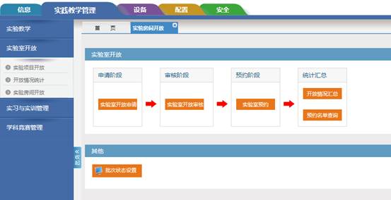 2.教师系统填报。由教务处审批后的开放实验项目由申请教师登录实验室管理系统(内网:http://10.1.1.48/)的实践教学模块中的实验室开放子目录下的实验室房间开放栏目进行项目的申报,由学院相关负责人审核,进行实验项目的预约,具体操作界面如下: