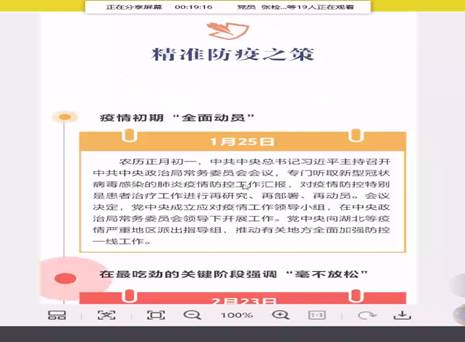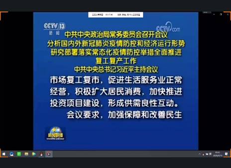 活动开始,支部书记带领全体成员进行视频学习,视频介绍了在此次疫情中,习近平总书记带领着全国人民一起战斗,采取了正确措施,及时遏制了疫情的蔓延。习总书记还强调:疫情防控工作尚未结束,绝不能放松警惕!
