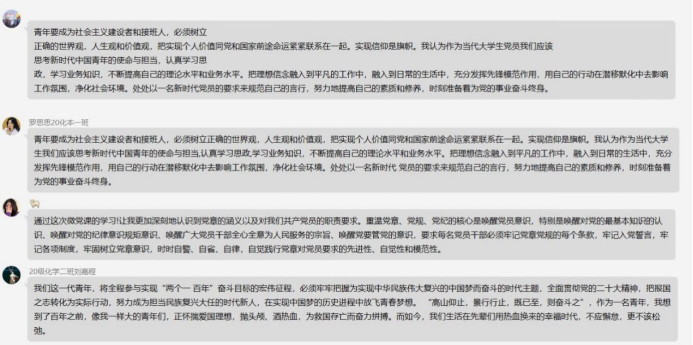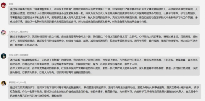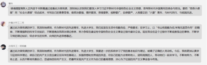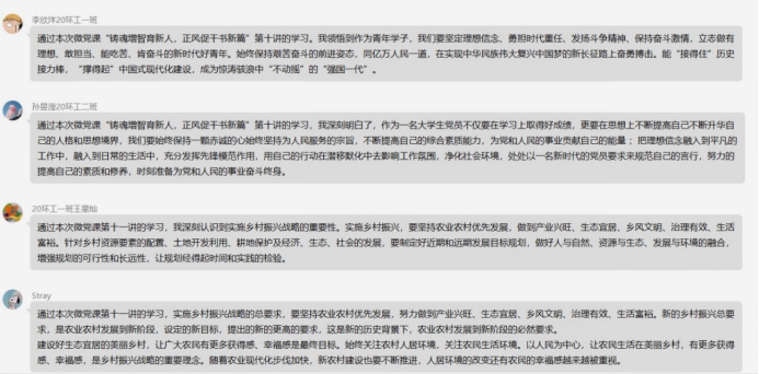 本次微党课学习安排每一期的主持人,主持人负责提前预约直播会议号,提醒大家及时观看直播学习;认真每一期党课之后,党员同志对照衡量自身的条件以及在哪些方面还有待提高,在群里分享自己的思想感悟。通过此次讨论学习,党员同志应该坚持学思结合、多思多想、学深悟透,做到科学指引、实干笃行、严督实导,真正把学习成果转化为不可撼动的理想信念,转化为担当重任的能力素养,切实以信仰之火逐梦新征程,书写高质量发展新篇章。