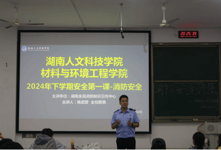 为提高材料与环境工程学院全体学生的消防安全意识,2024年10月24日晚7:20,学院组织同学们在致远楼119开展了一场别开生面的消防安全讲座。此次讲座由湖南全民消防知识宣传中心娄底分中心主任陈武赞主讲,旨在提高大学生群体的消防安全意识,增强应对火灾等突发情况的能力。