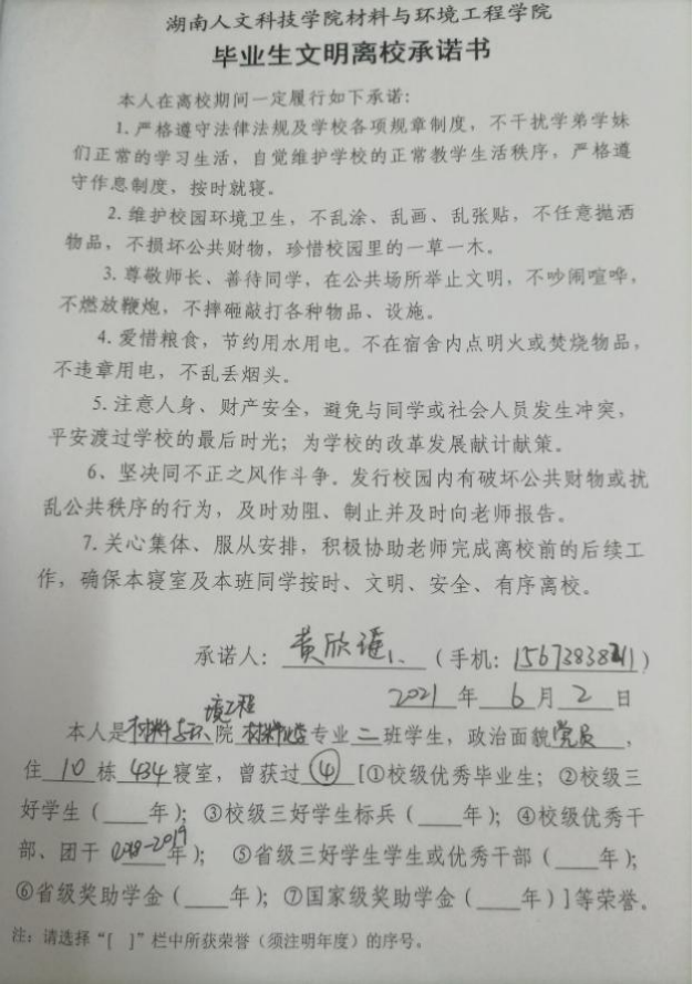 为欢送莘莘学子离开校园,同时创建好文明校园、维护好校园的稳定和正常教学秩序,材料与环境工程学院全体毕业生一起书写了毕业生文明离校承诺书,毕业生们表示“将把思念带走,把文明留下,留一片净土,存一片真心”。这不仅是全体毕业生高素养,高品质的表现,也是毕业生安全、健康、文明、有序离开母校的重要体现。