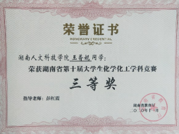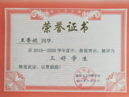 王香妮,1999年出生于湖南株洲。 她一直保持着积极向上的心态,本着严于律己的态度,努力使自己成为一名全面发展的大学生。在校期间,她从大二到大四连续三年获得“三好学生”,连续两个学期被评为“优秀团干”,还获得了“优秀学员”,“双创先锋”等荣誉称号。2019年11月成为正式党员。大三上学期,担任19级材料化学二班的代理班主任,通过分享自己的收获帮助学弟学妹们更好的开启大学生活。现担任材料与环境工程学院学生第二党支部副书记,协助支部书记开展各项工作,起到模范带头作用,于2021年被评为湖南省普通高等学校2021届优秀毕业生。大学四年,王香妮的成绩一直稳步提升,名列前茅。大三一年成绩绩点为4.16,位列年级第二,大四上学期获国家励志奖学金。课余时间王香妮积极参与学科竞赛,研创项目获得大学生研创计划国家级立项,湖南省第十届大学生化工学科竞赛三等奖,发表学术论文一篇。