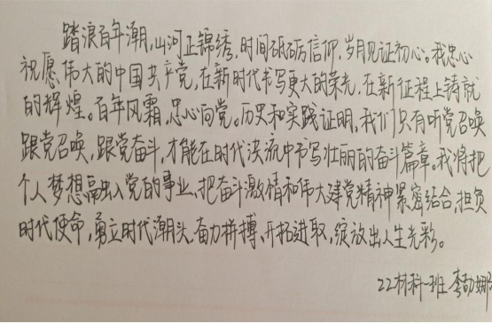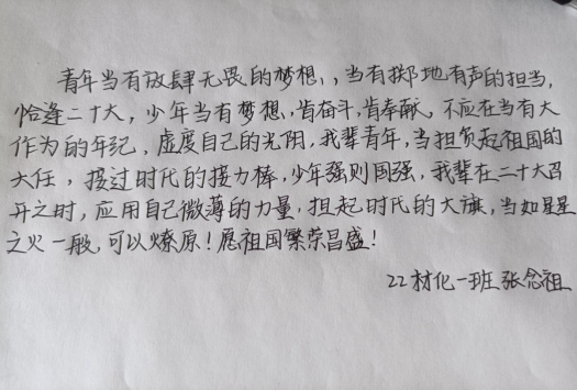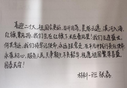 活动期间,材料与环境工程学院全体同学用笔墨写下了对大会成功召开的美好期待,有“不忘初心,砥砺奋进,喜迎二十大,祝愿祖国繁荣昌盛”的美好愿景,有“继续坚持疫情防控动态清零方针,希望疫情早日过去”的赤诚希冀,更有“请党放心,强国有我”的坚定信心,这些无不体现着材环学子对祖国前途命运的关注以及为国奉献的决心。