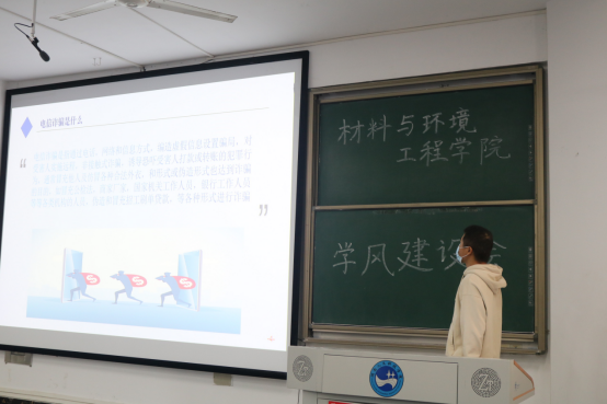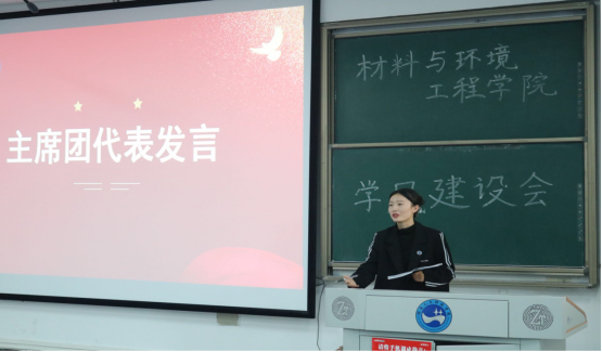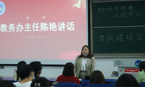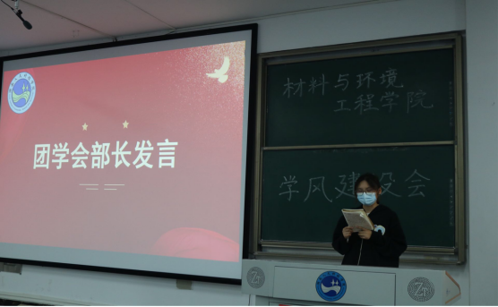 会议主题为“博学笃思,勤勉致知;学风建设,你我同行”。材料与环境工程学院党总支副书记陈佩君、教务办主任陈艳、辅导员老师、主席团、团学会各部长、20、21、22级各班班长、团支书、学委参会。