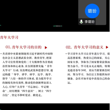 2月25日下午,材料与环境工程学院团总支书记李璐玢通过腾讯会议为材环院团培学子开展团务知识培训。
