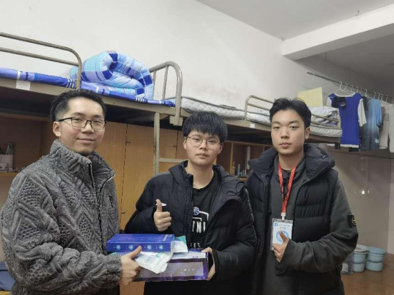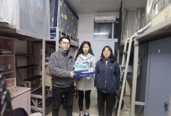 辅导员陈昱老师与文建部曹靓、尚昱丞为标兵寝室代表颁发礼品