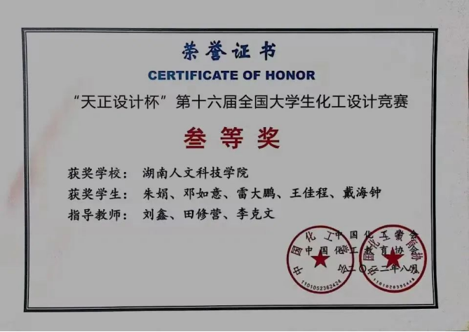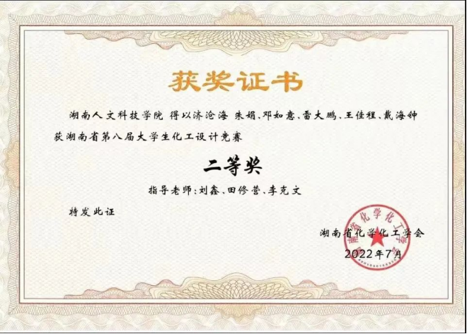 12.2022年获湖南省第八届大学生化工设计竞赛二等奖