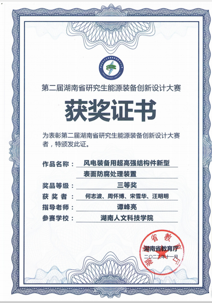 近日获悉,在此次大赛中,由太阳成官网谭峰亮博士指导,何志波、周怀博、宋雪华、汪明明的作品《风电装备用超高强结构件新型表面防腐处理装置》荣获大赛三等奖!