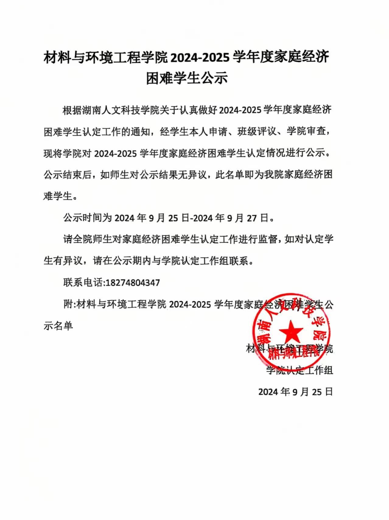 材料与环境工程学院 2024—2025 学年度家庭经济困难学生公示名单