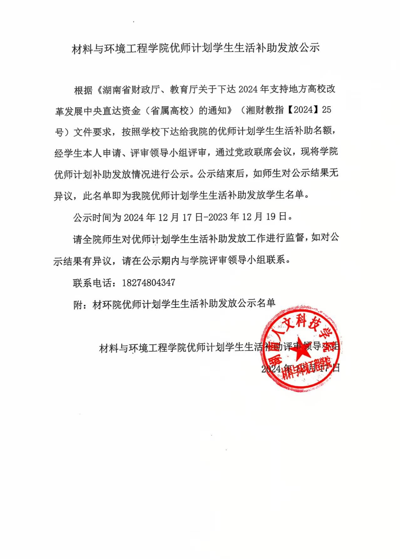 材环院优师计划学生生活补助发放公示名单