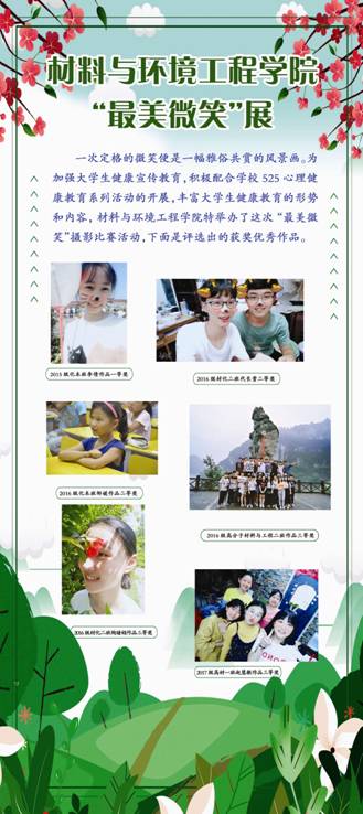 一次定格的微笑便是一幅雅俗共赏的风景画。为加强大学生健康宣传教育,积极配合学校525心理健康教育系列活动的开展,丰富大学生健康教育的形势和内容,材料与环境工程学院特举办了这次“最美微笑”摄影比赛活动,下面是评选出的获奖优秀作品。