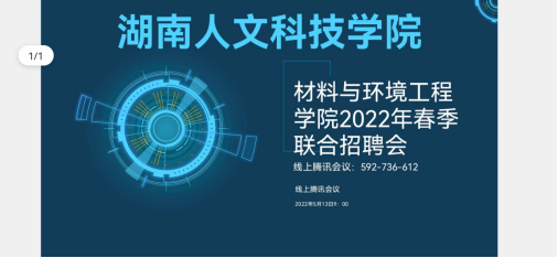 5月13日上午,材料与环境工程学院通过腾讯会议举办2022届春季线上联合招聘会。材环院院长文瑾,就业专干陈昱,各教研室主任、十家企业参会人员以及太阳成官网全体未就业2022届毕业生参加本次会议。会议由陈昱老师主持。