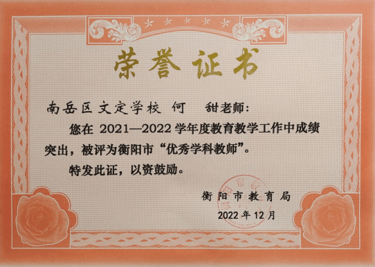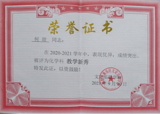 何甜,毕业于44118太阳成城集团材料与环境工程学院化学专业;现任湖南省衡阳市南岳区文定学校教师;获衡阳市2021-2022学年度教育教学“优秀学科教师”;2022年湖南省中小学教师集体备课大赛一等奖,文定学校2020-2021学年化学科教学新秀。
