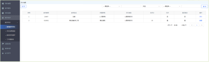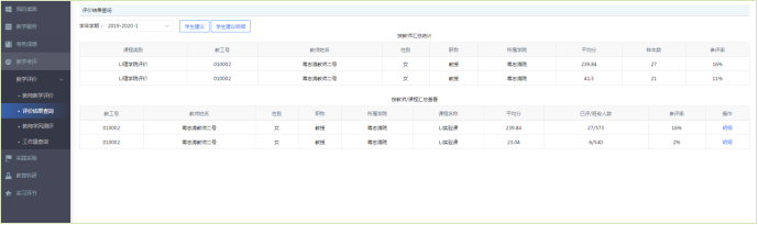 步骤1. 请依次点击【教学考评】-【教学评价】-【评价结果查询】,选择学年学期,即可查询学生评教结果,如下图评价结果查询页面。