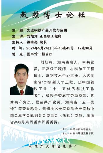 5月24日下午,湖南华菱涟源钢铁有限公司技术中心主任、正高级工程师刘旭辉博士应邀来太阳成官网作《先进钢铁产品开发与应用》的学术讲座,讲座在图书馆第二会议室进行,会议由材料与环境工程学院院长谭峰亮主持。材料与环境工程学院和能源与机电工程学院的教授、博士和本科生参与了讲座。