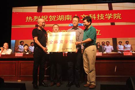 校长刘和云(右一)、金蝶集团董事局主席徐少春(左一)共同授牌,金蝶商学院首届院长朱强(左二)和金蝶商学院副院长刘健(右二)一同接过“金蝶商学院”牌匾