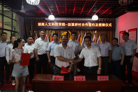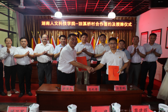 ▲研究生教育教学部主任彭建民代表学校与油溪桥村党支部书记彭育晚签订研究生教育校外实践基地协议。