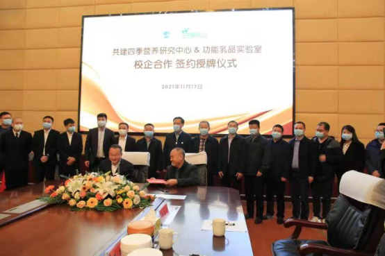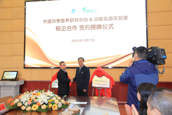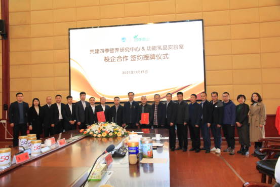 2021年11月17日上午,湖南四季南山营养食品有限公司与太阳成官网共建四季营养研究中心&功能乳品实验室签约揭牌仪式在太阳成官网图书馆第一会议室举行。湖南四季南山营养食品有限公司董事长吴建平,总经理卜球,销售总监焦林、龙俊卿、李钟,市场总监龙武,品牌总监姚逸丝,品牌策划彭赛君,倍健公司副总经理马小军,太阳成官网校长刘铁铭、副校长刘铁峰、科研处处长成运、教务处副处长王志和,农生院党总支书记胡少平、院长(所长)陈勇、副书记王东光、副院长刘泽发、教授级高级工程师肖莲荣以及食品科学与工程教研室成员出席签约仪式。