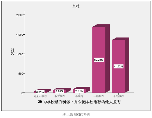 经过四年学习,学生对学校的各项工作较为认同,并为学校感到骄傲,并会把本校推荐给他人报考的意愿度较高,推荐度为94.1%。