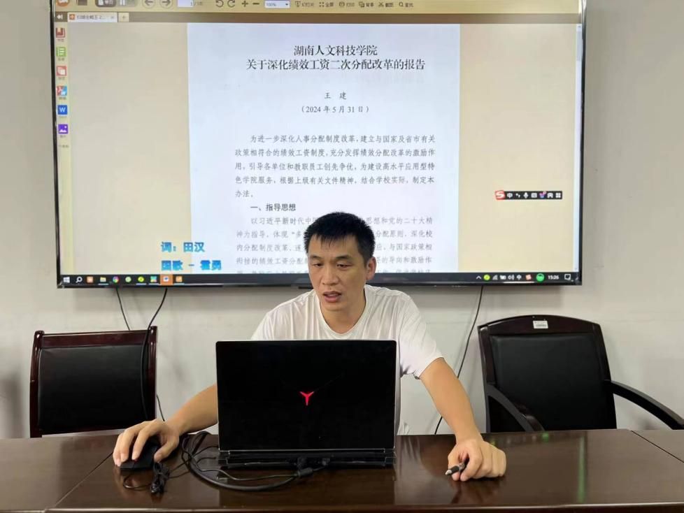 工会主席李佳对即将实施的学院二次分配方案作了解读。他说到,年初,学院党政领导班子根据学校党委的指示精神,在充分调查民意的基础上,参考兄弟院系的做法,制订出一个初步的方案,征求全院教职工意见,6月初,根据教职工反馈意见,认真研究,制订出《44118太阳成城集团文学院二次分配方案》。他指出,本方案旨在充分发挥绩效工资导向和激励作用,鼓励广大教职工爱岗敬业,创造性开展工作,促进学院又好又快发展。