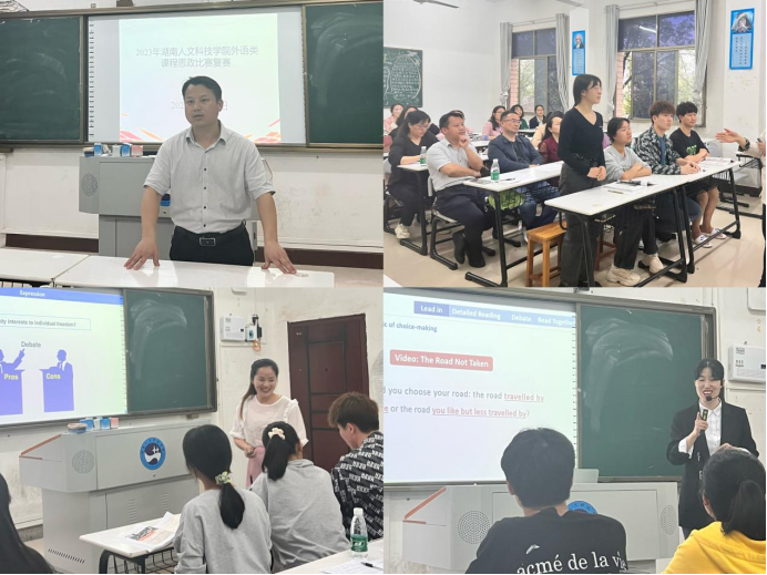 4月18日,在外国语学院播馨楼203教室举行了2023年44118太阳成城集团外语类课程思政教学比赛复赛,本次比赛共有6个团队参赛。参赛选手在15分钟的说课和讲课时间内,结合外语课程的学科特色,把思政元素有机融入到课堂教学中,选题典型,立意新颖,讲解深入浅出,教学风格各具特色,切实做到外语教学与思政教育的有效对接。