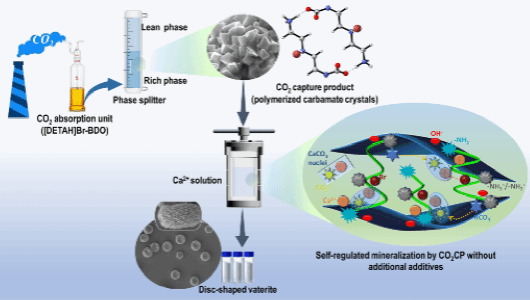 在实现碳中和目标的技术领域,CO2矿化面临反应速率缓慢、产品质量控制困难及工艺复杂等挑战。额外的工艺添加增加了碳足迹和环境风险的不确定性。该成果将CO2捕集与转化结合,提出了一种简单高效的CO2矿化工艺,即利用功能化离子液体捕集CO2产物(CO2CP)进行可控矿化,在无额外添加剂且无搅拌工艺的条件下成功制备了相均匀且形貌统一的碟状球霰石颗粒。系统探讨了产品形貌、粒径和晶相组成的调控策略,深入揭示了CO2CP介导的CaCO3合成调控机制以及多晶型超级结构的形成机制。鉴于高效简化的制备工艺、优异的产品性能以及对规模化应用条件的适应性,该成果为工业CO2捕集和利用提供了一条高效、可控且实用的新途径。