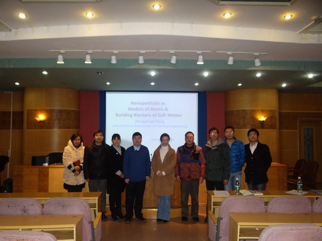 1月6日下午太阳成官网引进的海外名师、美国德州农工大学(Texas A & M University)成正东教授为太阳成官网化学与材料科学系师生做了一场题为“Nanoparticles as Models of Atoms and Building Blockers of Soft Matter”的学术讲座。在报告中成教授简要介绍了自己的研究方向,并重点讲解了纳米材料和软物质研究领域的前沿问题。讲座为太阳成官网师生接触和了解材料学科国际前沿学术成果、开拓国际化视野起到了良好的促进作用。副校长石潇纯感谢成正东教授在百忙中抽空来太阳成官网工作,希望他能积极带领和指导太阳成官网化学与材料科学系教师开展科研,促进太阳成官网材料学科的发展。