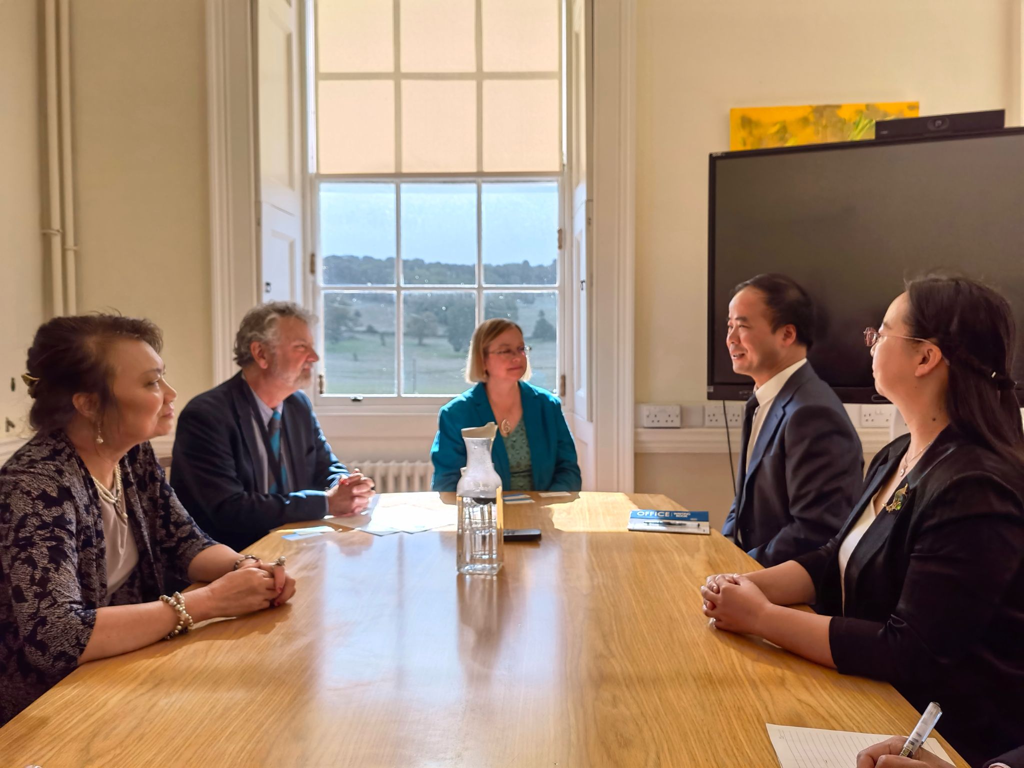 在巴斯斯巴大学,代表团与学校校长Georgina Andrews、副校长Simon Haslett、副校长John Strachan以及国际招生与合作部、教育学院负责人等举行会谈。座谈会上,英方校领导表达了对学校代表团一行到访的热烈欢迎,详细介绍了巴斯斯巴大学的情况,着重强调了学校在教育和人文领域的深厚底蕴,并对两校合作办学项目的深化表达了诚挚的意愿。盛明科向英方介绍了学校在联合培养项目方面的教育教学、实践实习、招生就业等方面的创新与改革。双方还交流了两校合作项目10年的主要成果,围绕中英合作办学项目的学生交流、课程建设、科研合作、数字教育、文化交流等主题展开深入探讨,就中英合作办学项目的具体实施、促进双方教学资源的共享、未来十年的合作进行系统谋划,达成多项共识。会上,两校签署了新的合作办学协议。