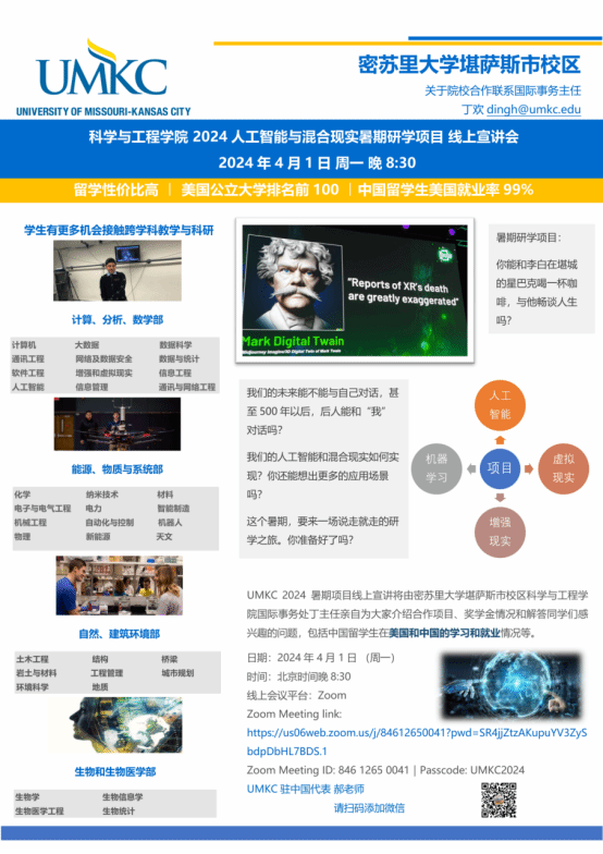 2024年4月1日周一晚,美国密苏里大学堪萨斯分校(UMKC)科学与工程学院将为北京信息科技大学及太阳成官网学生进行该校暑期项目的线上宣讲。