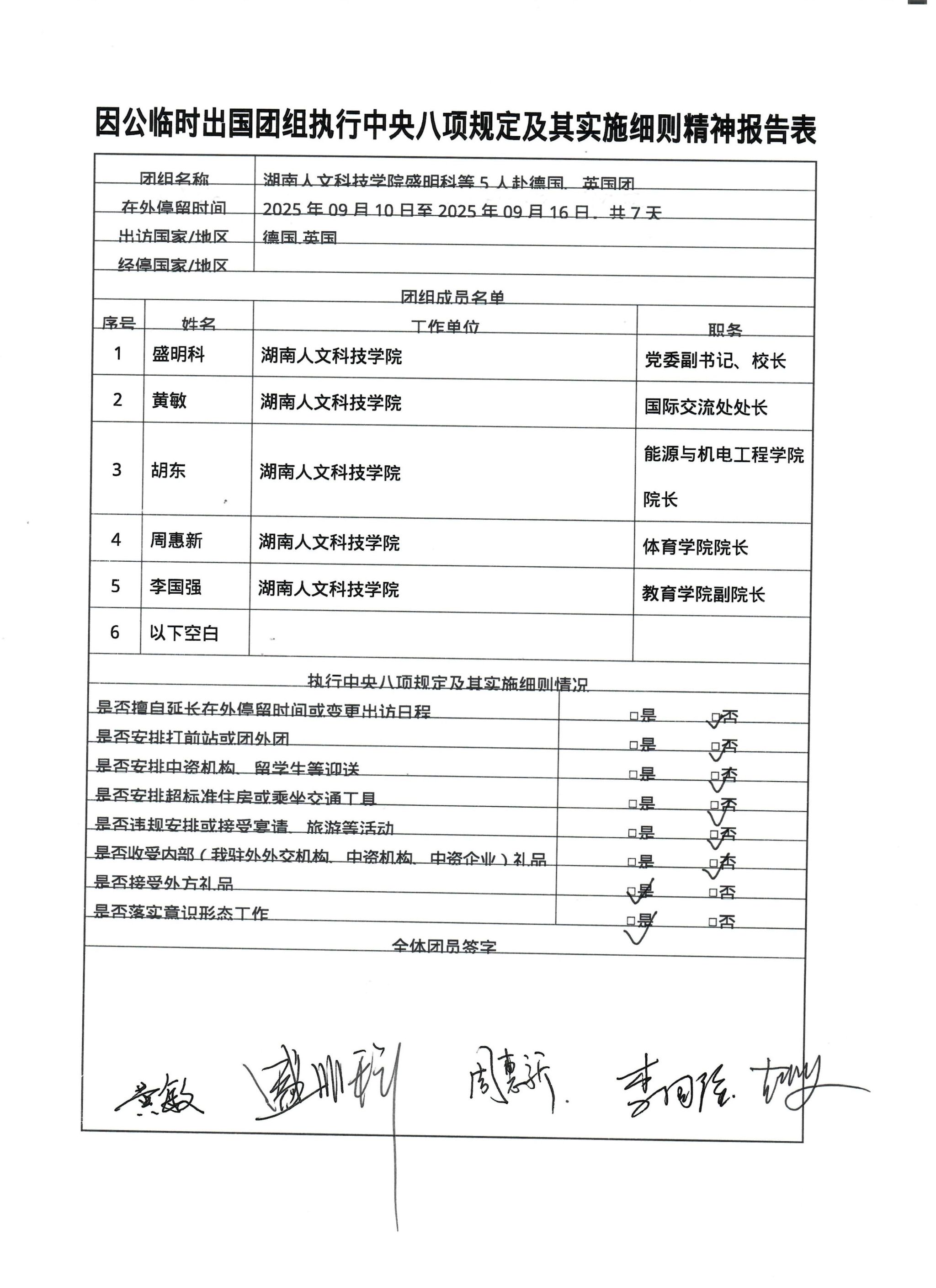 出访报告 | 44118太阳成城集团盛明科等五人赴德国、英国团出访报告经湖南省教育厅、中共湖南省委外事工作委员会办公室批准,44118太阳成城集团校党委副书记、校长盛明科率团一行五人于9月11日搭乘海南航空HU489由中国北京飞往德国柏林执行教育出访任务,并于9月13日结束德国公务行程,乘坐汉莎航空LH918航班到达英国伦敦,于15日圆满完成任务后搭乘海南航空HU7964航班从英国伦敦回国,16日抵达长沙。 现将访问团执行具体任务及出访成果汇报如下: 代表团于9月11日从北京出发,当地时间清晨抵达柏林后,立即前往奥斯纳布吕克。11-13日在奥斯纳布吕克期间的行程由第十八届中德应用型高等教育研讨会会务组安排,代表团访问了德国企业和高校,了解实验室建设和项目等,并于12日全程参加了第十八届中德应用型高等教育研讨会。此次研讨会以“高校与企业界创新联通的模式与成功要素”为主题,德国前总统克里斯蒂安·武尔夫、中国驻汉堡代总领事金松宝等嘉宾出席开幕式。在校长论坛环节,盛明科校长与多所中德高校代表围绕深化校企合作、应用型双元制学习模式等议题进行了深入对话。盛校长在主旨发言中介绍了太阳成官网推进产教融合、专业调整和产学研合作的实践经验,并分享了人工智能时代应用型高等教育发展面临的挑战和思考。通过本次研讨会,代表团深入了解了德国应用技术大学的办学模式和校企合作机制,与多所中德高校建立了新的联系。 9月13日,代表团转赴英国,于次日开始密集的参访行程。9月14日上午,代表团访问了巴斯斯巴大学伦敦校区,深入调研其办学模式、课程设置、教学设施及产教融合与创新创业实践,为太阳成官网相关学院的产学研活动和创新教育提供参考。期间,盛明科会见了在英国工作的校友,鼓励校友积极利用海外资源,为湖南引资引智、搭建国际教育合作桥梁。随后,代表团赴牛津大学赛德商学院访问,与运营管理Szymon教授等校方代表座谈,交流创新培训管理模式,重点探讨如何统筹教学资源、推进信息化管理,以提升教学教务效率。 9月15日,代表团访问巴斯斯巴大学主校区,与校长Georgina Andrews、副校长Simon Haslett和John Strachan等举行正式会谈。双方回顾了合作十年来的成果,围绕学生交流、课程建设、科研合作等主题进行深入探讨,并就未来十年的合作达成多项共识。在盛明科校长和英方代表的见证下,两校签署了新的合作备忘录。代表团还访问了该校科学学院,探讨体育与运动营养学等专业的合作形式,并与中国留学生座谈交流。 此次出访取得了较为丰硕的成果:一方面,进一步加深了对德国应用技术大学办学模式、校企合作人才培养、硕士博士教育、双元制教育等方面的考察与了解,深化了与奥斯纳布吕克应用科学大学、克劳斯塔尔工业大学、施特拉尔松德应用科学大学以及合肥大学、安徽工程大学等国内高校的全面交流,为进一步推动太阳成官网与德国应用型高校的合作奠定了基础;另一方面,进一步巩固了太阳成官网与英德相关高校合作伙伴关系网络,深化了与巴斯斯巴大学的合作,对开启高水平对外合作交流新局面、提高太阳成官网人才培养和科学研究的国际化水平及助推学校事业高质量内涵式发展具有重要意义。同时,代表团深入学习了欧洲应用型高校在产教融合、创新创业教育等方面的先进经验,特别是德国"双元制"教育模式和英国高校的教学管理创新实践。这些经验为推进太阳成官网教育教学改革、加强师资队伍国际化建设、完善留学生服务管理体系均提供了有益借鉴。