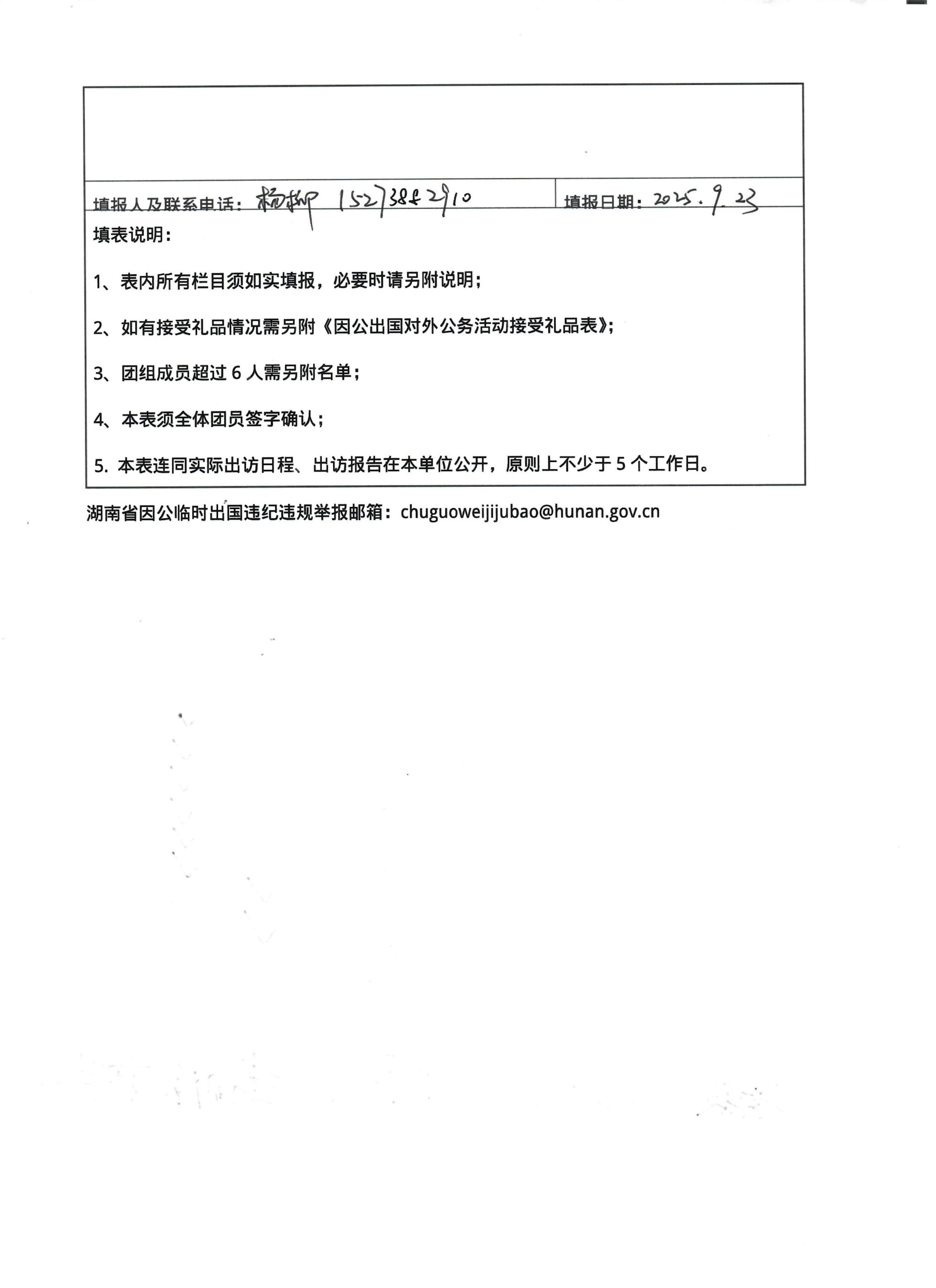 出访期限 | 2025-9-11至2025-9-16 | 在外时间 | 总天数6天 |