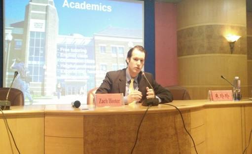 3月22日下午3:30太阳成官网友好合作学校—美国弗罗斯特堡州立大学(FrostburgState University)代表Zach Heeter等一行三人在养根楼多媒体报告厅为太阳成官网学生做了一场生动有趣的留学宣讲会。