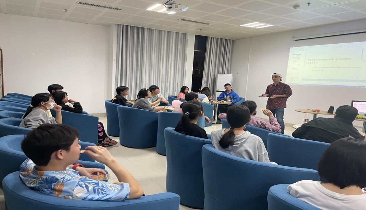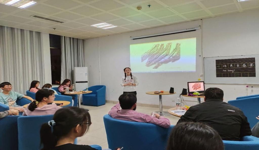 5月27日中外文化交流协会在图书馆中外文化交流中心开展Free Talking活动,协会30余位会员、外籍博士Noaman和Tarek、留学生代表Zeerak共同参与此次活动。活动围绕中外美食这一主题展开交流,同学们逐一展示中国各地的美食文化,外籍专家和留学生也踊跃交流和分享,活动现场气氛热烈。