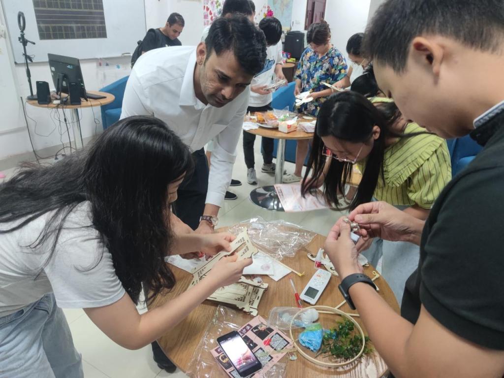 活动的竞猜灯谜环节中无论是字谜、词谜、诗谜,还是与美食、地域、节日相关的灯谜都显得有趣又契合节日主题,中外师生都争先举手,抢答谜底。制作花灯的环节,大家亲自动手,创造自己独一无二的作品。美食与手工相遇,中秋佳节在人文共度,情谊尽露于言表。