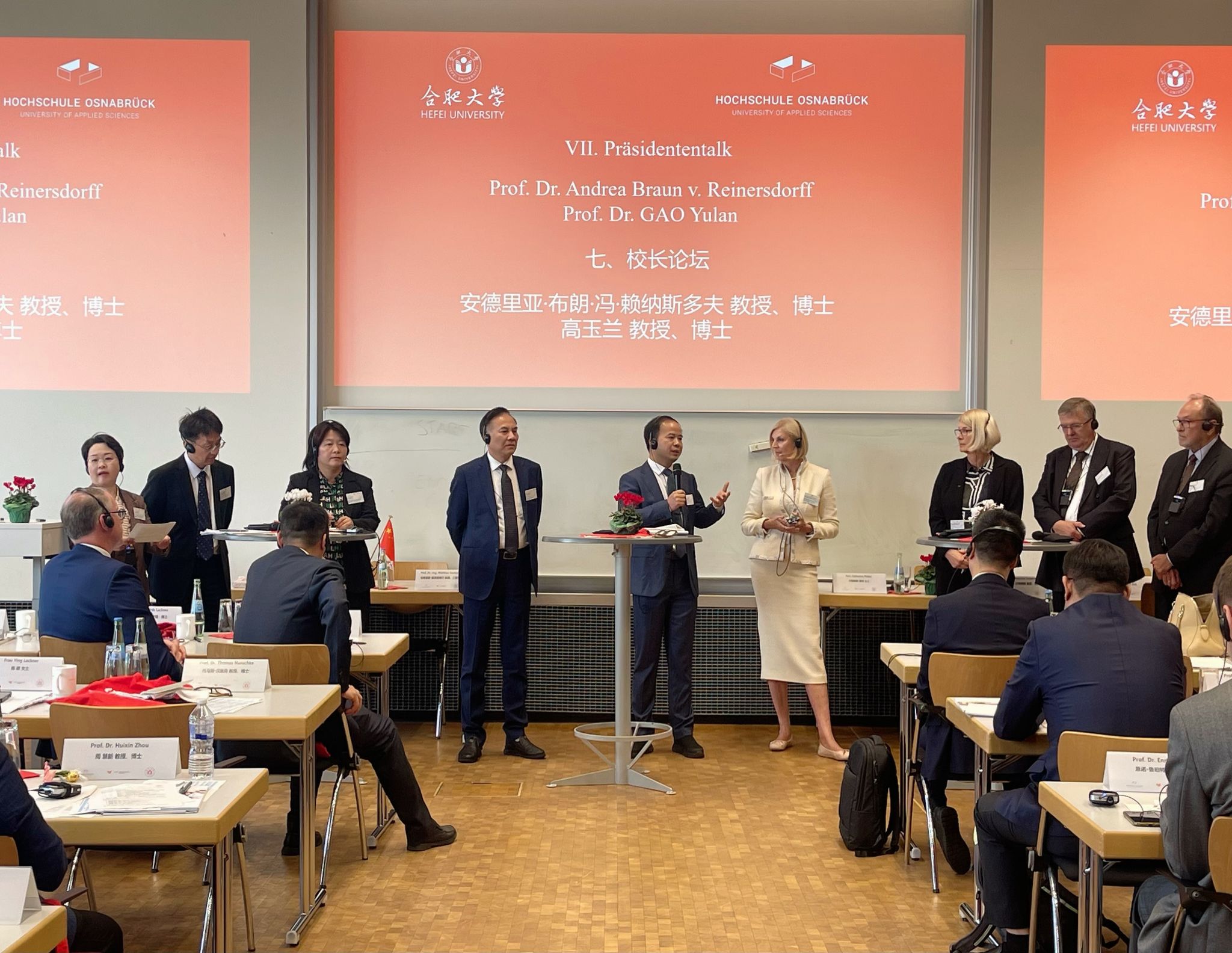 本次研讨会的主题为“高校与企业界创新联通的模式与成功要素”开幕式和大会报告结束后,盛明科校长比勒菲尔德应用科学大学校长英格博格·施拉姆-沃尔克萨克森双元制应用科学大学前校长安德里亚斯·汉塞尔湖南文理学院党委副书记李红革克劳斯塔尔工业大学前校长托马斯·汉施克蚌埠学院校长张亚新施特拉尔松德应用科学大学前校长法尔克·霍恩皖西学院党委副书记胡林娜以圆桌对话形式展开校长论坛,就中德两国如何深化校企合作、如何在应用型双元制学习模式中达成高效合作进行了深入探讨。校长论坛由奥斯纳布吕克应用科学大学经济与社会科学学院院长安德里亚·布朗·冯·赖纳斯多夫淮北师范大学副校长高玉兰联合主持。