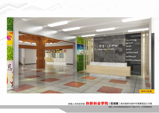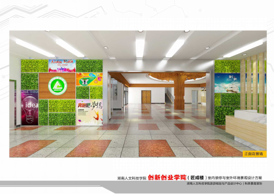 配合创新创业基地整体建设方案,打造创业文化形象。一楼公共大厅配合宣传区功能进行装饰和布置;四楼公共大厅形成一个独立的创业文化区角;