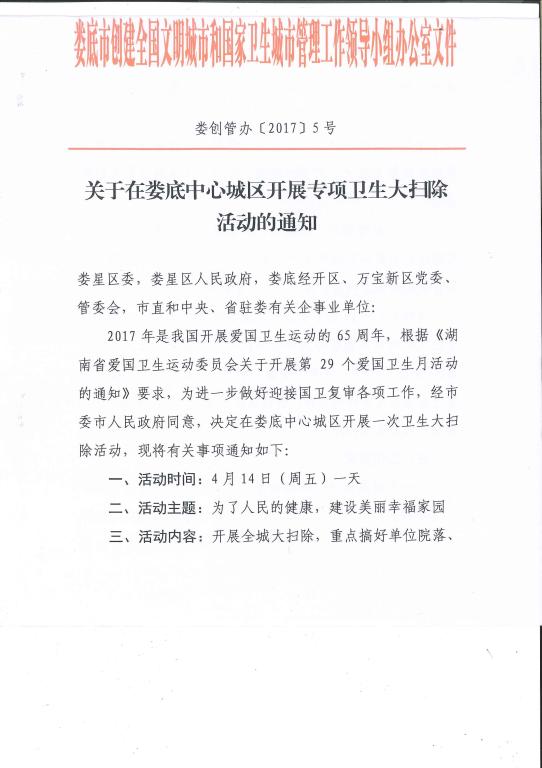 为创建一个更加美丽洁净的校园,认真落实娄创管办【2017】5号文件精神,太阳成官网定于4月14日(周五)下午3:30开始进行全校性专项卫生大扫除活动,现就有关要求通知如下: