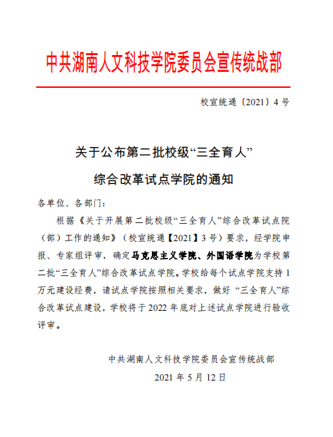根据《关于开展第二批校级“三全育人”综合改革试点院(部)工作的通知》(校宣统通【2021】3号)要求,经学院申报、专家组评审,确定马克思主义学院、外国语学院为学校第二批“三全育人”综合改革试点学院。学校给每个试点学院支持1万元建设经费,请试点学院按照相关要求,做好 “三全育人”综合改革试点建设,学校将于2022年底对上述试点学院进行验收评审。