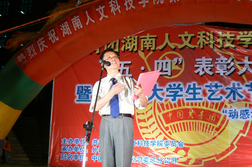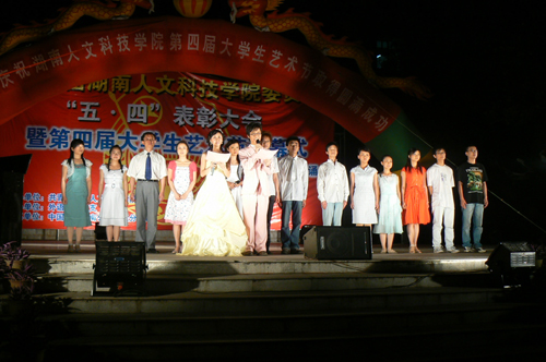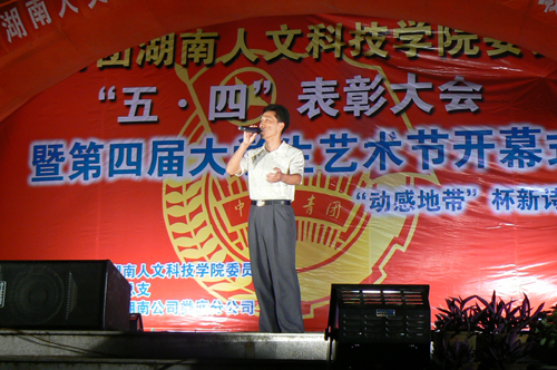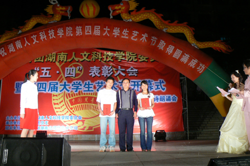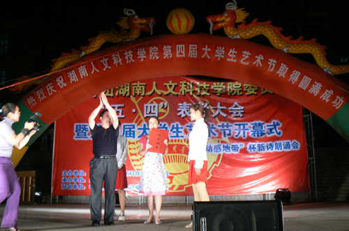 5月17日晚7点30分,学院五四表彰大会暨第四届大学艺术节开幕晚会在海园广场隆重举行。星光耀眼,气氛热烈,格调高雅,反响极佳。院党委书记黄懿斌,党委副书记、院长姜正国,党委委员、纪委书记李尚益,党委委员、副院长谢祥清,党委委员、工会主席邓和秋,党委委员、党办院办主任李高海,院长助理刘铁铭,宣传部部长雷立成,学工部处长谢光绎,团委书记侯建斌,外语系系主任周巧红等领导出席了表彰会并观看了演出,学院4000多人参加了表彰大会。