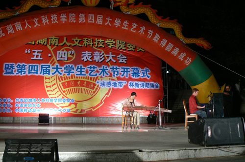 黄书记在讲话最后郑重宣布“学院第四届大学生艺术节开幕”。在优雅、舒缓的钢琴曲中,由院团委主办、外语系团总支承办的新诗朗诵会拉开了序幕,整个新诗朗诵会由老师和学生同台演出,格调高雅,品味独特,在“人间至情”、“望乡之路”、“家园之魂”、“祖国之恋”四个朗诵板块中表达了师生至真至善至美的情怀。院长助理刘铁铭的一首《乡愁》,以富有磁性、掷地有声的声音抒发了盼望台湾回归的愿望,将朗诵会推上了一个高潮。外教Grahm与刘利连老师的钢琴古筝合奏也是朗诵会的一个亮点。