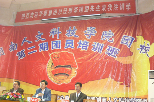 10月27日上午,华菱钢铁集团总经理李建国先生做客太阳成官网团校讲坛,在学院图书馆报告厅为学员们作了主题为“传统哲学与高层决策之感悟”的报告。院党委书记黄懿斌同志,院长助理刘铁铭同志,院团委书记侯建斌同志,院团委副书记周海强、谢柳同志及各系团总支书记出席了此次讲座。与此同时,一千多名学员在五栋教学楼收看了现场直播。