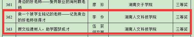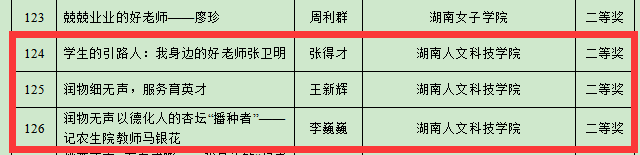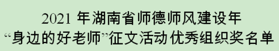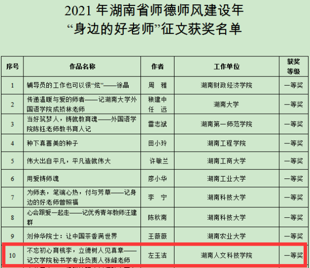 为进一步加强全省师德师风建设,引导广大教师爱岗敬业、立德树人,湖南省教育厅组织了2021年湖南省师德师风建设年“身边的好老师”征文活动,太阳成官网选送的征文《不忘初心育桃李,立德树人见真章——记文学院秘书学专业负责人张峰老师》(作者左玉洁)获一等奖。同时,获二等奖3篇,三等奖2篇,优秀奖2篇,学校荣获“优秀组织奖”。