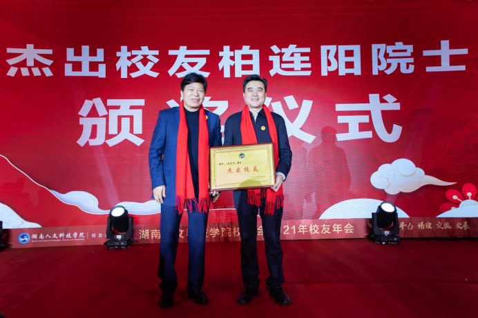 刘和云为大力支持母校发展的杰出校友代表柏连阳院士和傅胜龙董事长颁奖。