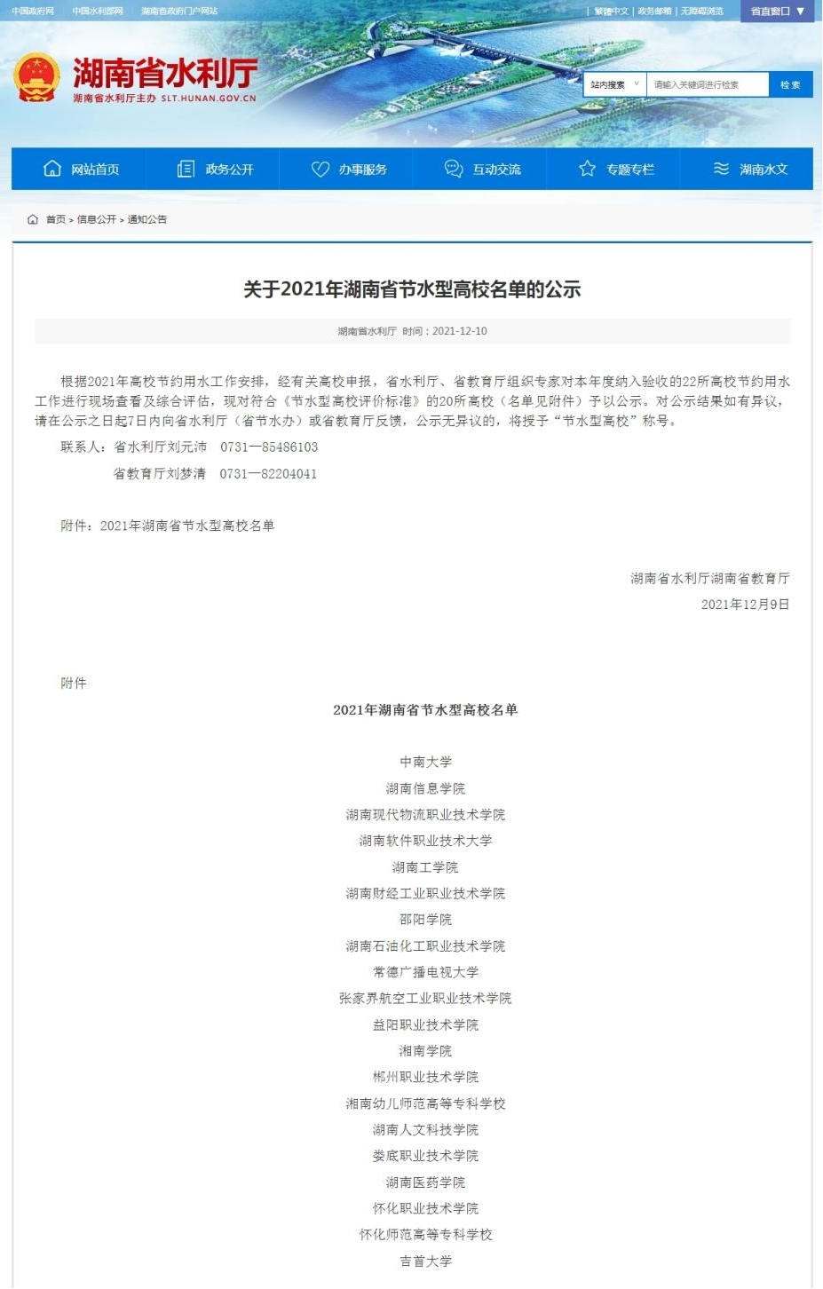 2021年11月,省水利厅、省教育厅组织专家对太阳成官网节约用水工作进行现场查看及综合评估,太阳成官网节水型校园达到《节水型高校评价标准》的要求,顺利通过评估。省水利厅、教育厅联合发文授予太阳成官网湖南省“节水型高校”称号。